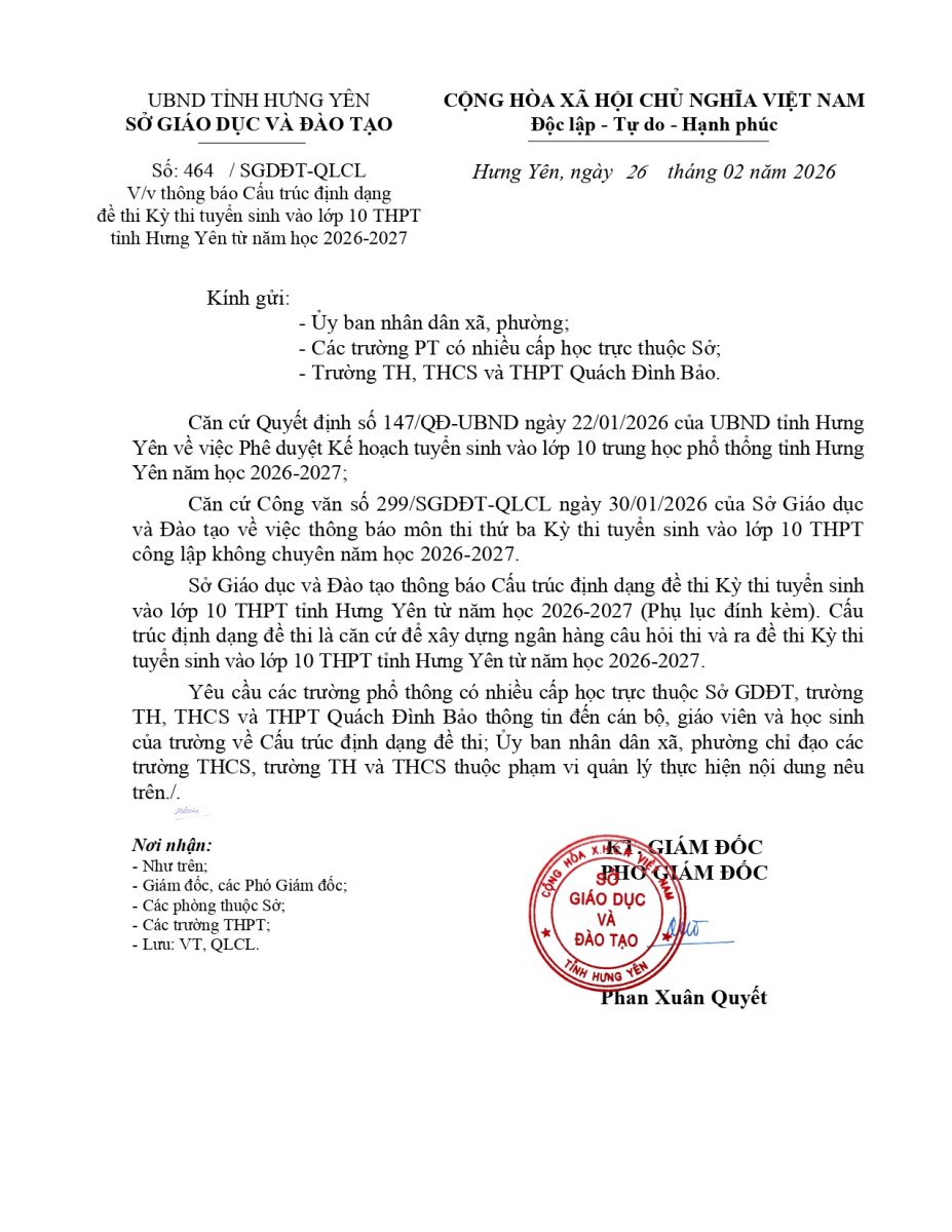 Thông báo Cấu trúc định dạng đề thi Kỳ thi tuyển sinh vào lớp 10 THPT tỉnh Hưng Yên từ năm học 2026-2027(28/02/2026)