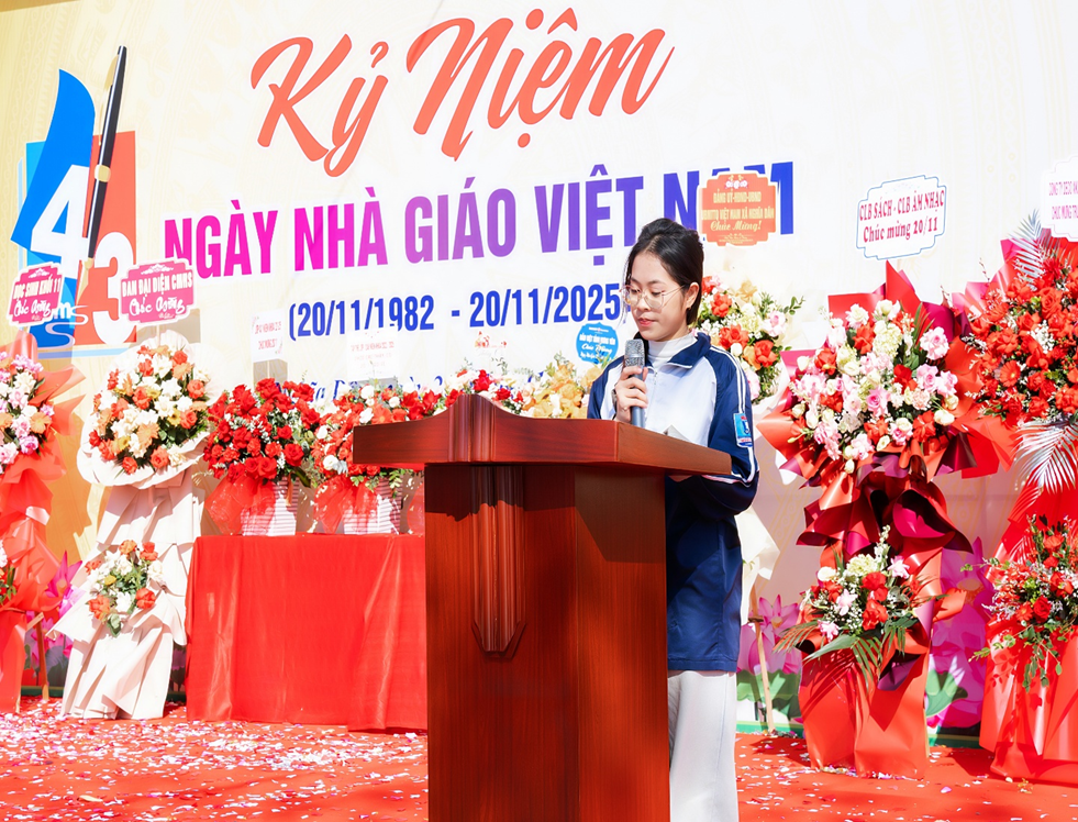 Tiếp theo chương trình, em Đào Thị Minh Thư đại diện cho học sinh toàn trường phát biểu đầy xúc động: “Chúng em xin cảm ơn thầy cô - những người không chỉ dạy kiến thức, mà còn dạy chúng em biết sống tử tế, biết yêu thương, biết ước mơ và nỗ lực. Mỗi thành công sau này của chúng em đều có bóng dáng thầy cô”.